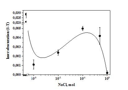 In NaCl solutions with ionic strength I = 0.001 mol, the light scattering ability of the solution drops sharply and becomes close to that of deionized water. A 100-time increase in the ionic strength of the solution contributes to the formation of water GHC, the light scattering ability of the solution increases dramatically.