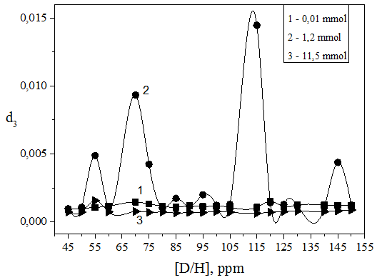 The graph shows a downward trend in the level of "noise" in the water in case of the replacement of protium by deuterium. Consequently, the D/H ratio can act as the "control" parameter of water GHC size distribution.