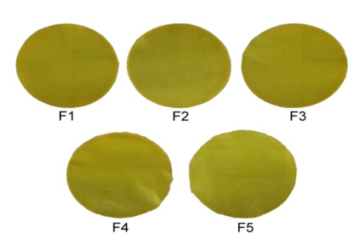 The results of the organoleptic evaluation of the five formulas showed that all of the formulas generated a smooth surface texture, dry, elastic, yellow, menthol-odor, and transparent properties. The curcumin nanoparticles transdermal patches are shown in fig. 1. All of the physical characterizations of the transdermal patches, including the pH, thickness uniformity, weight uniformity, percent moisture content, and tensile strength, are shown in table 2 and table 3.