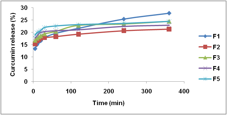 The results of the drug release study of the curcumin nanoparticles transdermal patches showed that at 360 min the curcumin release in F1 was higher than those in another formula. The curcumin release from the transdermal patches varied from 21.31% to 27.82% (fig. 2).