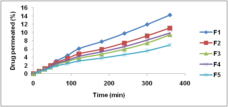 The results of the skin permeation study of curcumin nanoparticles transdermal patches show that curcumin could penetrate into the skin with the percent transport of curcumin in F1 being higher than that in other formulas. The percentage of drug permeated in F1 to F5 at 360 min was 14.24%, 11.08%, 9.46%, 9.89%, and 6.98%, respectively (fig. 3). The flux values in F1 to F5 are tabulated in table 5.