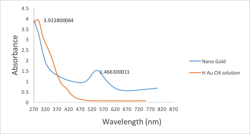 Colour changes during GNP synthesis are caused by excitation of surface plasmon resonance, which is expressed as characteristic features of synthesized nanoparticles in the study of diagnostic and therapeutic applications of gold nanoparticles depending on their synthesis and characterization. The absorption peak was recorded at 540 nm in the spectrum of UV-visible. The peak of the nanoparticles is broadened in the absorption spectrum. For the biological and biomedical application, it is found that the broadening of the peak in the absorption spectra indicates the poly-dispersion of the nanoparticles from a study involving the peak of absorption and properties of scattering of gold nanoparticles [2]. UV–vis absorption spectra maximum of H Au Cl4 at 290 nm, while absorption spectra maximum of gold nanoparticles with extract of Muntingia at 540 nm (fig. 1). It displayed that these changes are consistent with an initial rapid reduction of Au(III) to Au( °) and showed that the biosynthesis gold nanoparticles had been formed. Furthermore, the presence of an absorption band at 550 nm is suggestive of the presence of gold nanoparticles.