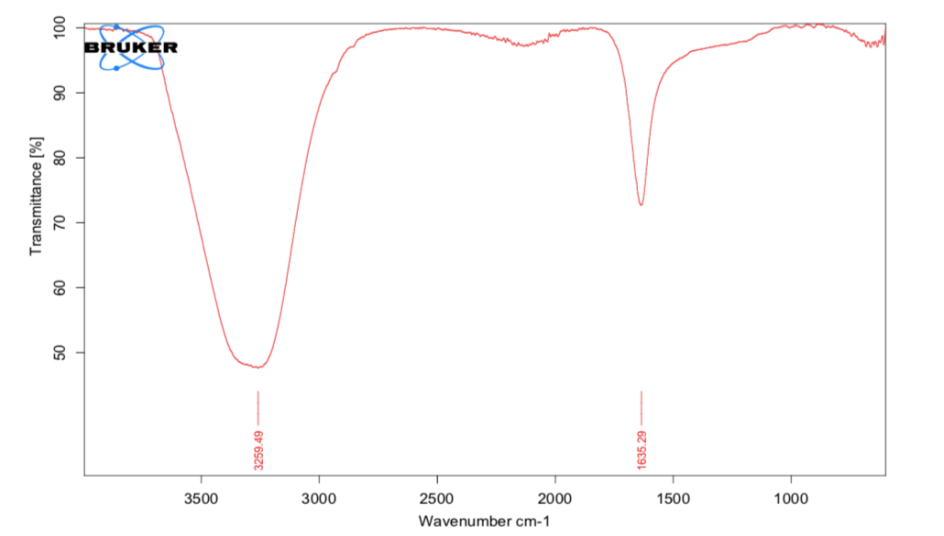 The Attenuated total reflection-Fourier Transform Infrared (ATR-FTIR) spectrum explains the interaction of gold nanoparticles with aqueous leaf biomolecules of Muntingia calabura. A robust and broad peak recorded at the wavenumbers 3259.49 cm-1 shows the presence of O-H functional group with H bonded at 3259.49 cm-1 indicating the presence of phenol and NH functional groups in Muntingia calabura. An absorption band appeared at 1635.29 cm-1 correspondings to C=C stretching vibrations confirming the presence of alkenes and aromatics (fig. 2). It was stated that the presence of phenols and alcohols is indicated by the O–H stretching vibrations between 3200 cm-1 and 3400 cm-1 and the presence of alkenes and aromatics is shown by the C=C stretching vibrations between 1575 cm-1 and 1675 cm-1. The depth and width of the band are indicative of the intensity and abundance of the particular functional group in that band [20].