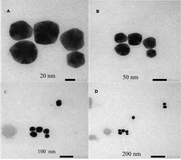 Fig. 3: Representative TEM images of the synthesized GNPs (A) on 20 nm scale (B) on 50 nm scale (C) on 100 nm scale (D) on 200 nm scale
