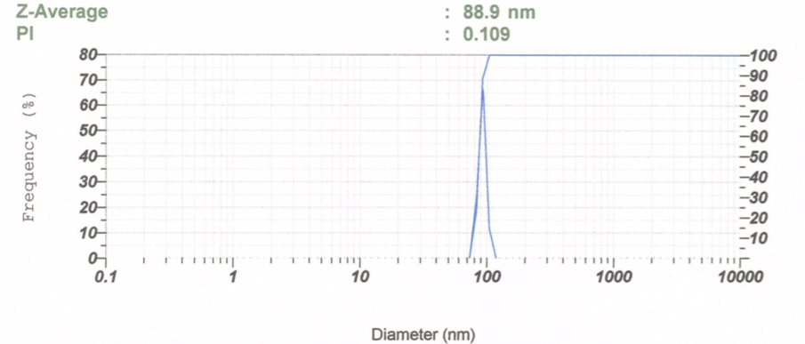 In DLS, the nanoparticle solution is illuminated by a monochromatic. All the same, the primary objective of a DLS measurement is still for size (distribution). The size distribution histogram of dynamic light scattering (DLS) showed that the z-average size of the synthesized GNPs is 88,9 nm with a polydispersity index is 0.109 (fig. 4). It indicated that the distribution consisted of a single size mode without aggregates. The range for the PDI is from 0 to 1. Values of PDI nearby to zero indicate a homogeneous dispersion, and those higher than 0.5 indicate high heterogeneity [23].