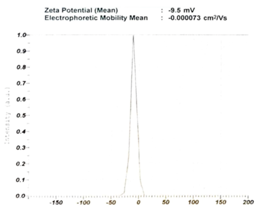 Also, zeta potential is an essential characteristic of nanoparticles, which is to predict the stability of the colloidal solution. The interaction among particles is critical to the stability of the colloidal solution. Zeta potential is a value that indicates repulsion force between particles. The colloidal solution stabilized by the presence of electrostatic repulsion rejected. The higher the repulsive force among particles rejected will cause the particles to be close to each other and will form aggregates. Nanoparticles with a zeta potential of+/-30 mV below stable nanoparticles [24].