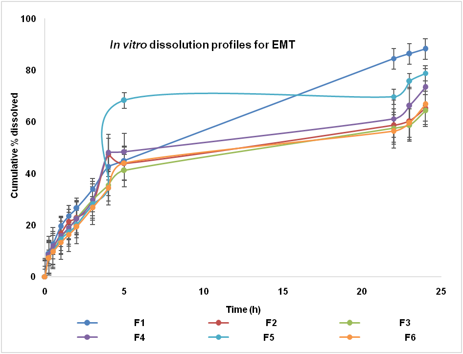 using 900 ml of 0.1N HCl (pH 1.2) as the dissolution medium at 50 rpm. One EMT tablet from each formulation was placed in each basket and was allowed to run for 24 h. Aliquot of 5 ml was withdrawn at predetermined interval subsequently replaced with an equivalent amount of fresh buffer to sustain a constant volume. Collected samples were suitably diluted as required and analysed at 291 nm spectrophotometrically [18].