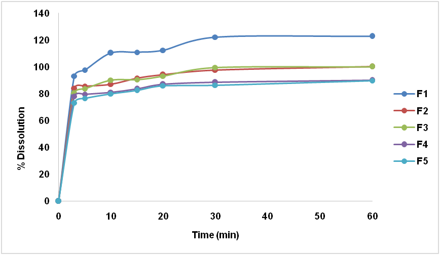 Table 4, showed that the DE60 value of formula I was greater than the other formulas. Differences in the composition of super disintegrant in every formula gave distinction in dissolution test results (DE60). Where the increase in the number of Ac-Di-Sol in each formula gave distinctive dissolution results. Ac-Di-Sol increases water penetration through porous surface into the tablet [29], resulting in rapid dissolution time.