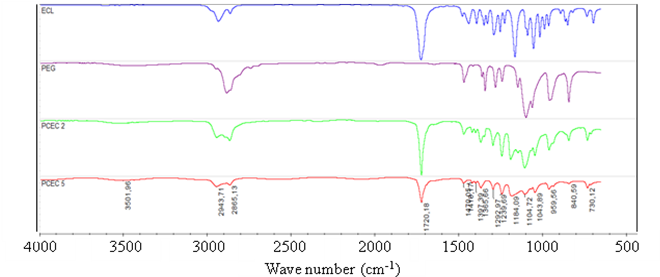 Fig. 1: FTIR spectra of ɛCL, PEG and PCEC with different ɛCL/PEG ratio