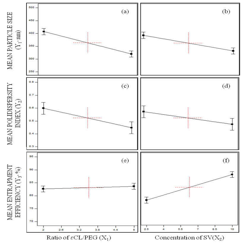 The graphs in fig. 3 showed the changes in the mean of all responses on these factors from min to max value. Also, the graphs can be known as the contribution of each factor on the increase or decrease of the observed responses. The first graphs, X1 (Y1)(a) and X2 (Y1)(b), shows that PS significantly decreases with increasing the ratio of ɛCL/PEG and also increasing the concentration of SV. That was contradictory to the research conducted by Hu et al. [7] previously, showed that the Y1 was increased gradually with the increasing the X1 and X2 factors [7, 13].