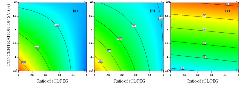 Fig. 4: Contour plot interaction of factors (ratio of ɛCL/PEG and concentration of SV) on responses particle size (a), polydispersity index (b) and entrapment efficiency (c)