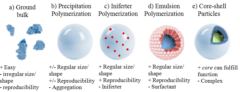 Alternative methods provide imprinted polymer in regular size and shape. The other methods, including precipitation polymerization [27,28], emulsion polymerization [29], iniferter polymerization [30], and core-shell particles [31]. Precipitation polymerization gives a better control of shape and size. Iniferter polymerization and emulsion polymerization are other alternatives to improve monodispersity. Iniferter polymerization uses iniferter (red in fig. 2) to stabilize particles at a particular size, while emulsion polymerization uses surfactant. Core-shell particles utilize cores which can have several functions. Then, MIPs is polymerized on the surface of the core [1].