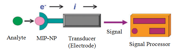 The schematic representation of the application of MIP-NP in electrochemical sensors is shown in fig. 3. This device consists of MIP-NP, transducer or electrode, and signal processor. The transducer is modified by adding MIP-NP onto its surface as a recognition element of the target analyte, which will increase sensitivity and selectivity by enhanced analytical response for the quantification. When MIP-NP binds to the target analyte, the transducer will produce electrical signal depend on the concentration or number of target analytes that are bind to MIP-NP. Then, the signal was measured by the signal processor electrochemically, either through voltammetry, amperometry, potentiometry, or impedance [14, 36–38].