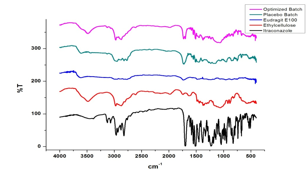 The change in frequency and bandwidth of different interacting groups in the spectrum of the mixture of drug and excipients are studied by FTIR analysis [33]. The FT-IR spectral bands of itraconazole, ethylcellulose, Eudragit E100, placebo microspheres and optimized drug loaded formulation are shown in fig. 1. On the interpretation of spectra, it is clear that all characteristic peaks of the drug are intact. Hence, no major shift or addition of new peaks indicated that no significant chemical interaction between drug and polymers.