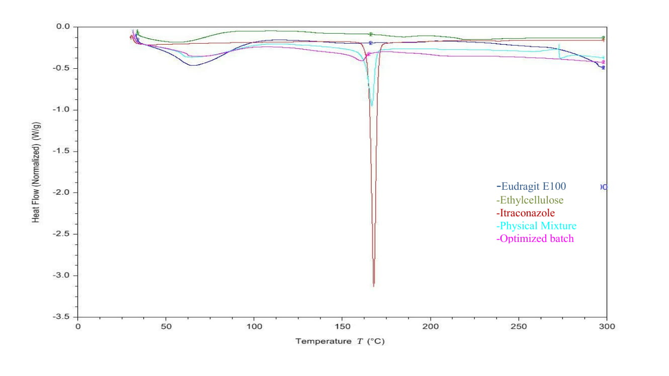 Fig. 2: DSC thermogram of itraconazole; ethylcellulose; eudragit E100; physical mixture and optimized batch