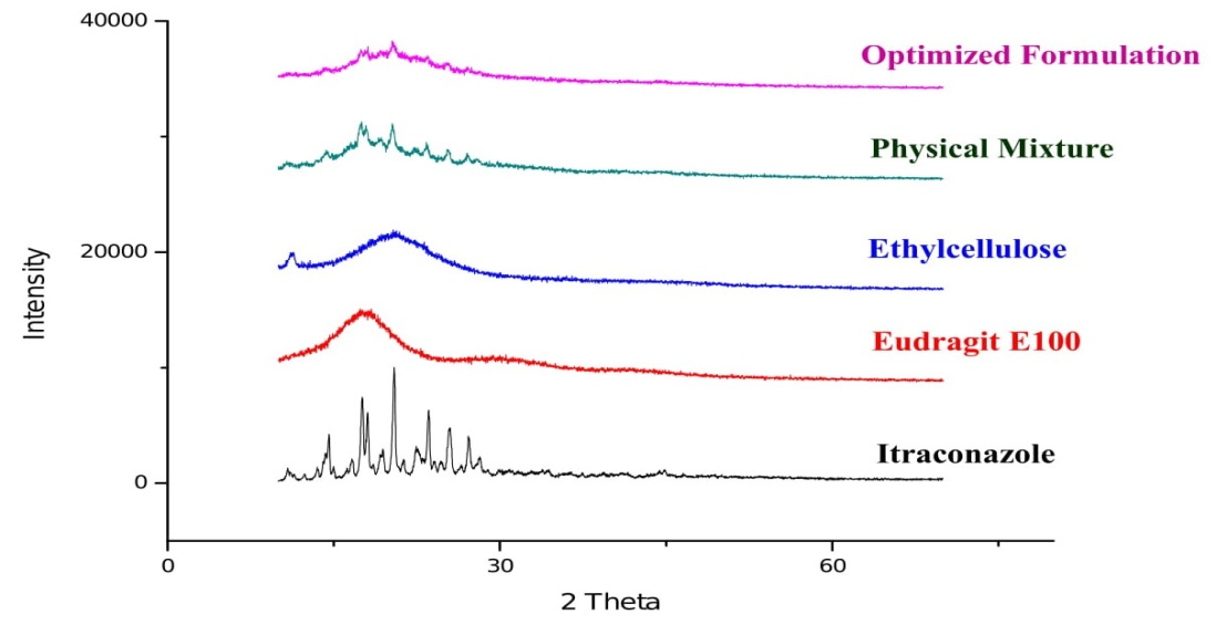 The X-ray diffraction pattern shown in fig. 3, the pure drug showed a range of sharp and distinctive peaks at 2θ angle of 23.58 °, 20.46 °, 17.58 ° and 14.58 °, having maximum peak intensity at 2θ angle of 20.46 ° indicating crystalline nature of the drug. The physical mixture showed peaks of itraconazole. The DSC results were confirmed by diffractograms of the optimized batch which exemplify the absence of sharp distinctive peaks of itraconazole.