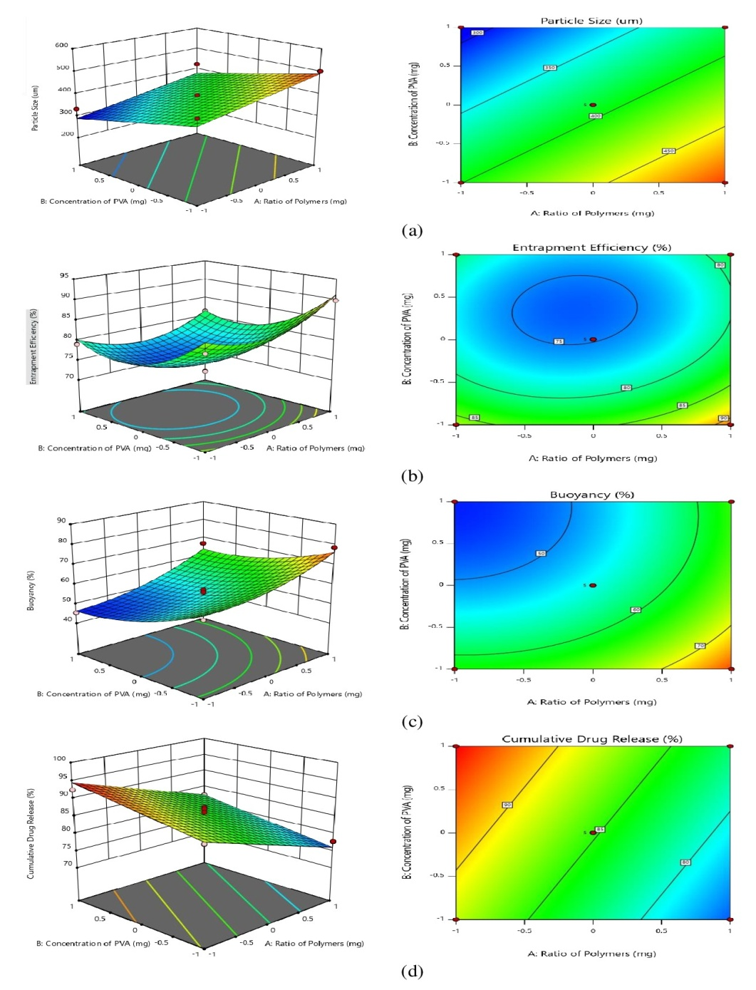 From the polynomial equations, the contour plots and 3D response surface graphs were generated (displayed in fig. 4) signifies that the polymer ratio and concentration of PVA carry a significant effect on particle size, entrapment efficiency, buoyancy, and drug release.