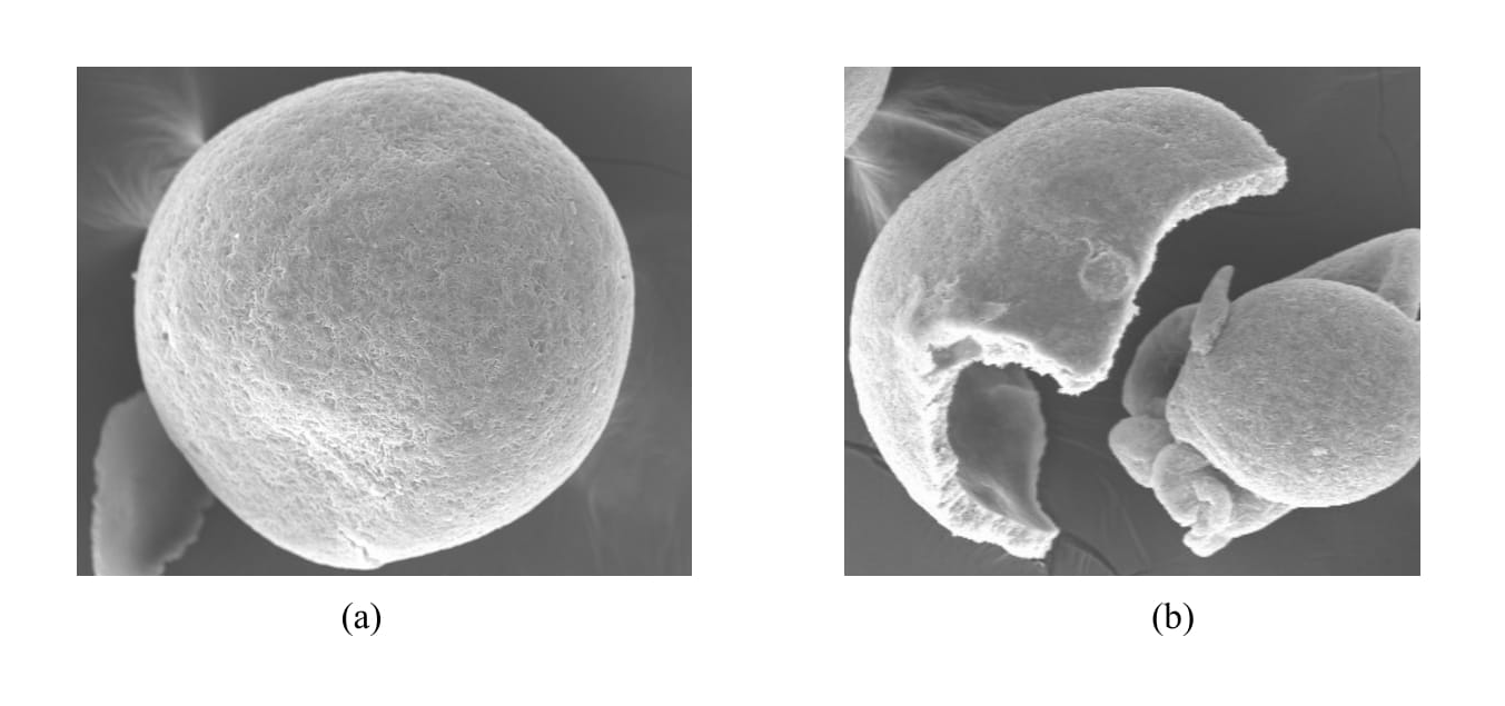 Fig. 6: SEM image of the surface view of a hollow microsphere; (b) SEM image showing central hollow cavity