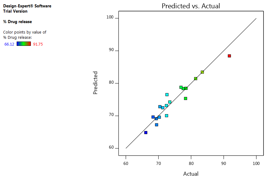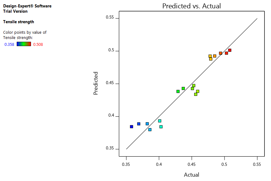 The Predicted R2 of 0.7008 is an insensible agreement with the Adjusted R2 of 0.8611; for example, the thing that matters is under 0.2. A proportion more noteworthy than 4 is desirable. Here the proportion of 15.938 demonstrates a sufficient signal (table 8). This model can be utilized to explore the design space.