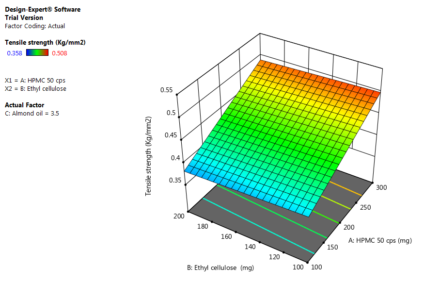 Effect of formulation variables on the tensile strength of the film is a decent way to break down the mechanical properties of the film (fig. 4). A delicate film has low percent lengthening and tensile strength, while the hard and weak film is described by low stretching and moderate tensile strength. It was observed in plotting another surface graph that, an increase in HPMC extent in the polymer blend gives higher tensile strength to the film. It revealed that with increment in the amount of EC (hydrophobic polymer), a decline in tensile strength was observed. It very well may be inferred that the preparation containing high convergence of HPMC 50 cps and almond oils has higher tensile strength [16, 18]