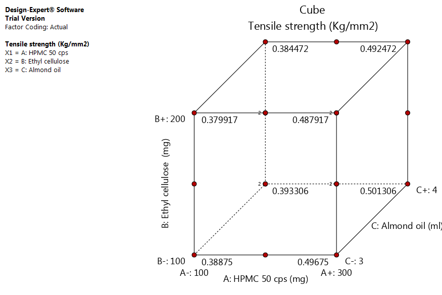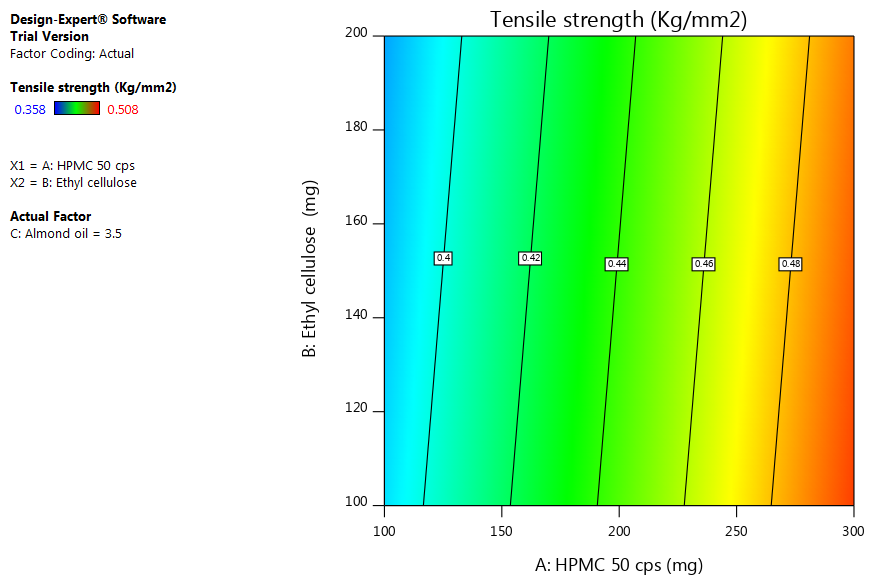 Tensile strength = 0.329917+0.000540* HPMC 50 cps-0.000088* Ethylcellulose+0.004556* Almond oil.
