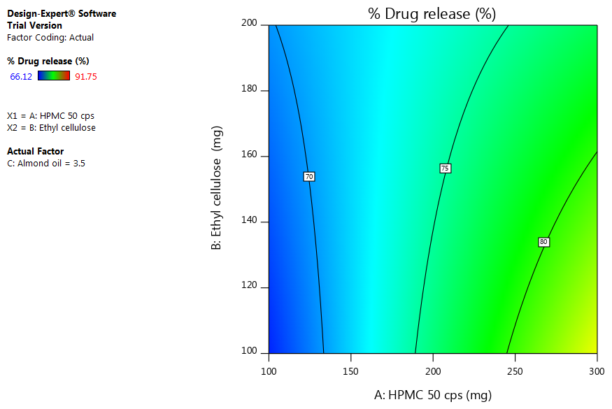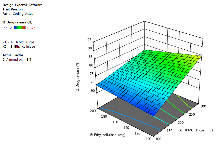 % Drug release=+26.00917+0.096637* HPMC 50 cps+0.218117* Ethyl cellulose+6.78167* Almond oil-0.000544* HPMC 50 cps * Ethyl cellulose+0.013567* HPMC 50 cps * Almond oil-0.038633* Ethylcellulose * Almond oil.