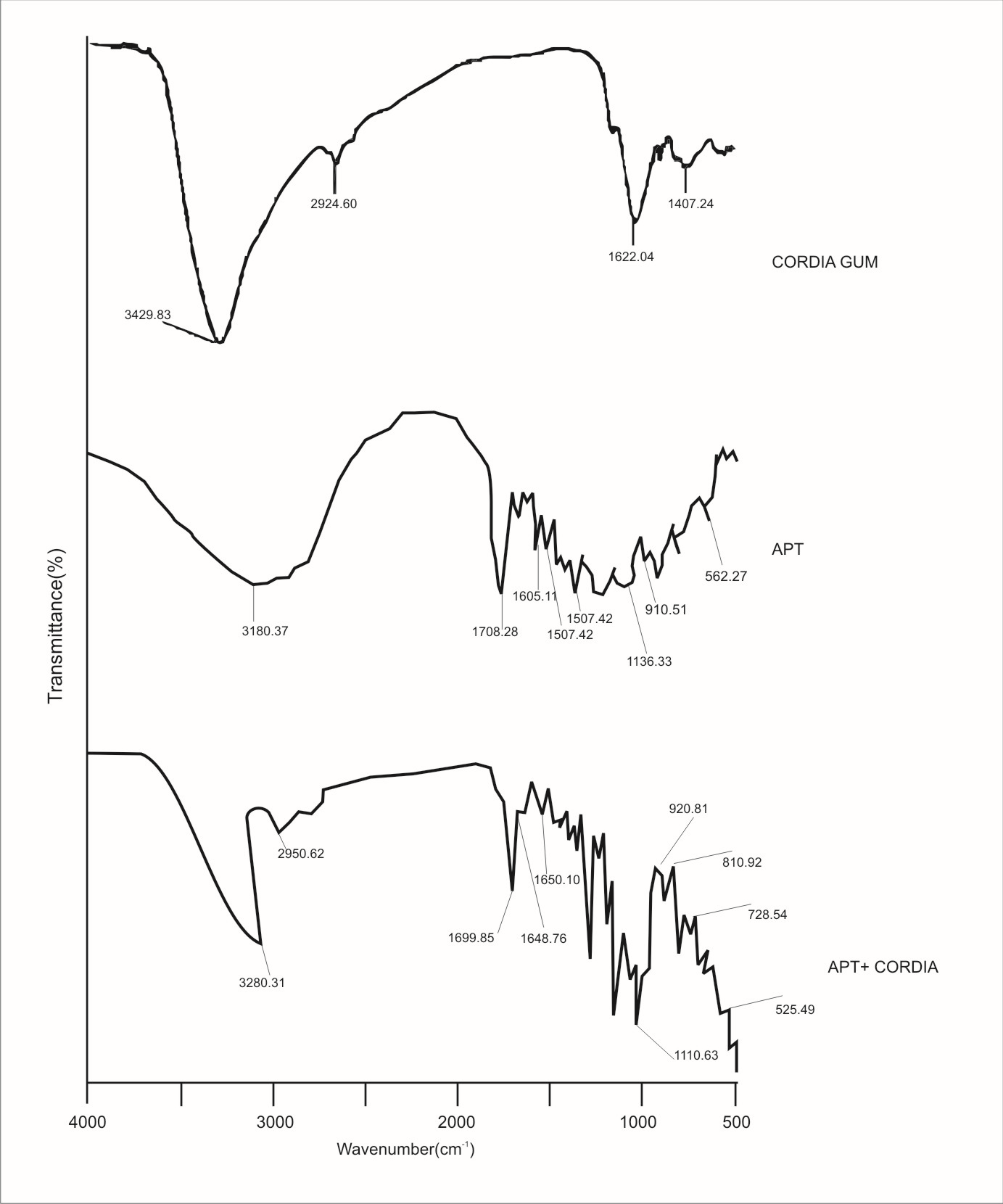 Fig. 1: Comparison of FT-IR of cordia dichotoma, aprepitant (APT) and mixture of both
