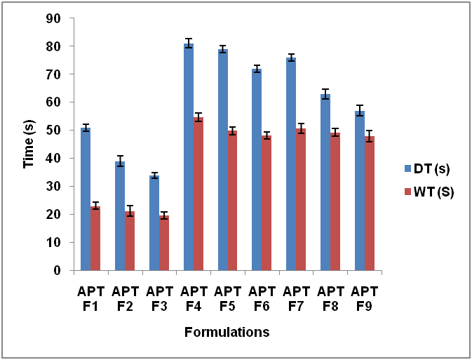 Fig. 8: Graphical presentation of DT and WT of all batches (mean±SD, n = 3)