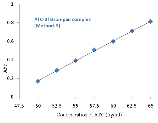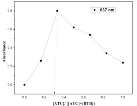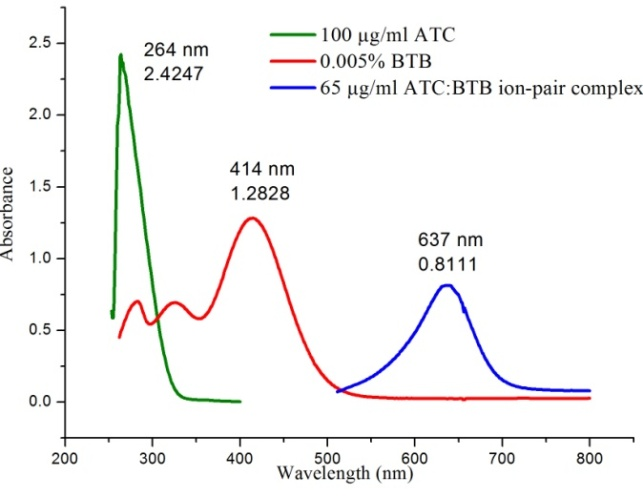 Varying aliquots of the standard 100 µg/ml ATC solution from 2.50 ml to 3.25 ml were transferred to different 5 ml calibrated flasks using a micro burette and added 0.5 ml of 0.05 % BTB solution to each flask which was diluted up to the mark with DMSO. It was shaken well for getting the uniform concentration. The absorbance of the resulting colored complex was measured at 637 nm against the corresponding blank solution prepared in the same method without the addition of ATC.
