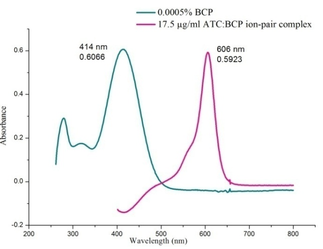 Different aliquots of 25 µg/ml ATC drug solutions (2.5 ml, 2.75 ml, 3.0 ml…4.0 ml) were transferred to 5 ml volumetric flasks. To each flask, 0.5 ml of 0.005 % BCP solution was added and diluted up to the mark with DMSO. The content was shaken well for the uniform concentration. The absorbance of the resulting colored complex was measured at 606 nm against the corresponding blank solution.