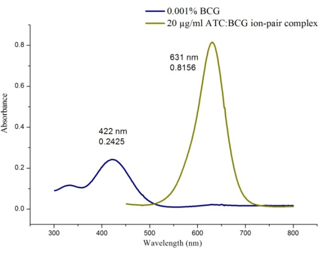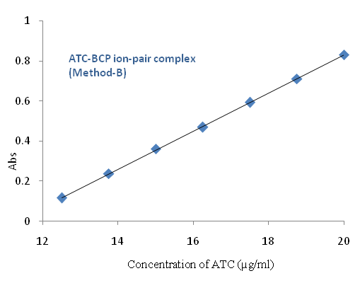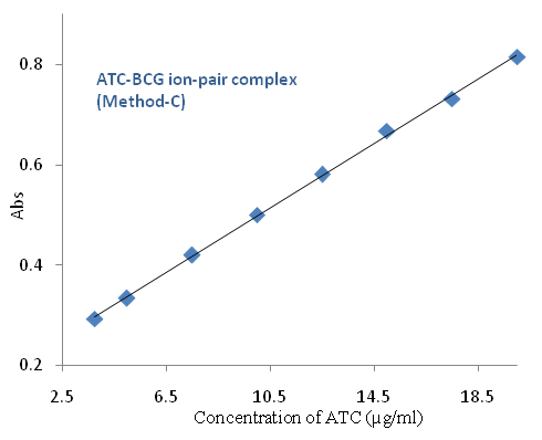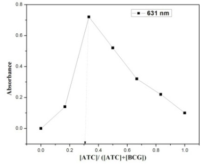 In a series of aliquots 0.75 ml, 1.00 ml, 1.50 ml. 4.00 ml of 25 µg/ml ATC solutions in 5 ml volumetric flasks, 1.0 ml of 0.005 % BCG was added and diluted up to the mark with DMSO. They were shaken well for the uniform concentration. The absorbance of the resulting colored complex was measured at 631 nm against the corresponding blank solution.