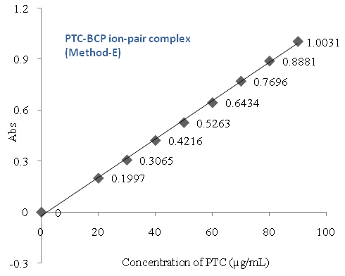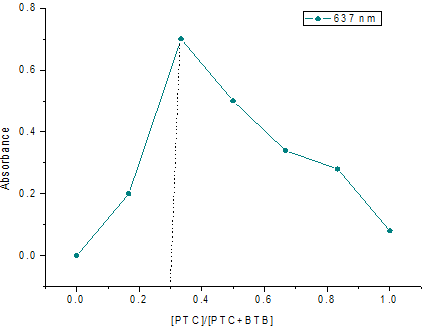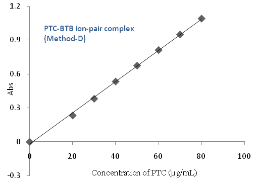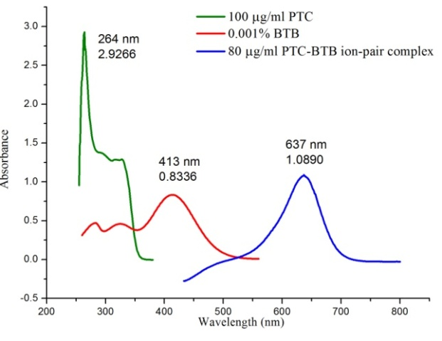 Aliquots of different dilutions (1.0, 1.5, 2.0, 2.5, 3.0, 3.5 and 4.0 ml) of 100 µg/ml PTC was transferred into a series of 5 ml volumetric flasks using a micro burette, then added 0.5 ml of 0.01 % BTB to each flask, diluted up to the mark with dimethyl sulphoxide and shaken well for uniform concentration. The absorbance of each solution was measured at 637 nm against the reagent blank prepared in a similar way without the addition of PTC.