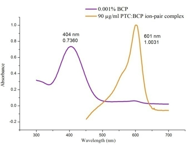 Aliquots of different dilutions (1.0, 1.5, 2.0, 2.5, 3.0, 3.5, 4.0 and 4.5 ml) of 100 µg/ml PTC were transferred into a series of 5 ml volumetric flasks using a microburette and 0.5 ml of 0.01 % BCP was added to each flask. They were diluted up to the mark with a 50:50 ratio of dimethylformamide and acetonitrile and shaken well for uniform concentration. The absorbance of each solution was measured at 601 nm against a reagent blank prepared in a similar way without the addition of PTC.
