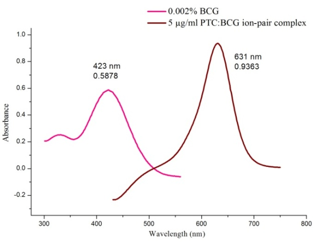 The absorption spectra of the formed ion-pair complexes between ATC or PTC and each of BTB, BCP and BCG the at 190-1100 nm against the corresponding reagent blank. The different colored ion-pair complexes showed maximum absorbance at 637 nm for both ATC: BTB and PTC: BTB, 606 nm for ATC: BCP, 601 nm for PTC: BCP, 631 nm for both ATC: BCG and PTC: BCG, which was shown in the fig. 2. In all cases, a bathochromic shift occurred, i.e., shifted towards the longer wavelength from the shorter wavelength. These reactions were rapidly occurring at room temperature.