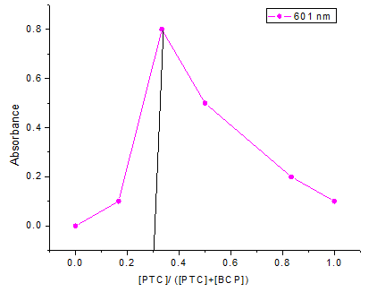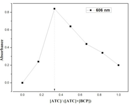 The absorbance of forming ion-pair complexes in each composition was measured and plotted against the mole fraction of the drugs, which was shown in the fig. 3. The plot reached a maximum value at a molar ratio of ATC or PTC to reagents in the complexes was determined by applying Job’s method of continuous variations. In all cases, the plots reached a maximum value at a mole fraction of 0.3 which indicated the formation of 1:2 ion-pair complexes.