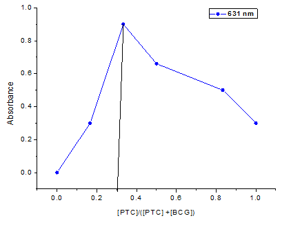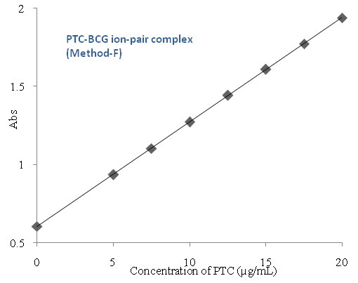 Aliquots of different dilutions (1.0, 1.5, 2.0, 2.5, 3.0, 3.5 and 4.0 ml) of 25 µg/ml PTC solution were transferred into a series of 5 ml volumetric flasks using a micro burette and 1 ml of 0.01 % BCG solution was added to each flask. The mixture was diluted up to the mark with dimethyl sulphoxide and shaken well for uniform concentration. The absorbance of each solution was measured at 631 nm against a reagent blank prepared in a similar way without the addition of PTC.