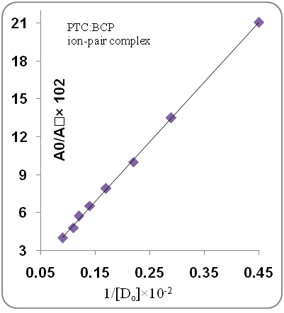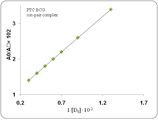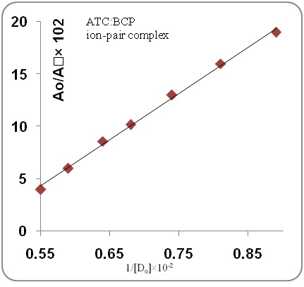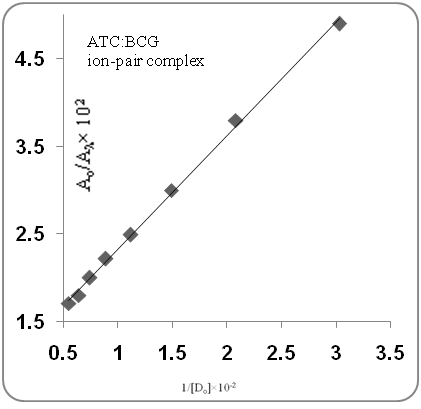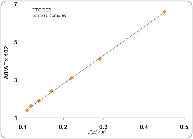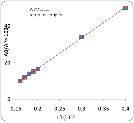 The association constants for the formed ion-pair complexes between ATC or PTC and the reagents were determined by using Benesi–Hildebrand equation where [BTB], [BCP], [BCG], [ATC] and [PTC] were the total concentration of the respective reagents and statin drugs. Ac is the absorbance of the complex, εc is the molar absorptivity of the ion-pair complex, and KIP is the association constant of the formed ion-pair complex. The values of KIP were obtained from the slope of lines by plotting [reagent]/Ac against 1/[ATC] or 1/[PTC] for all the developed methods. All the obtained plots were linear as shown in fig. 4.