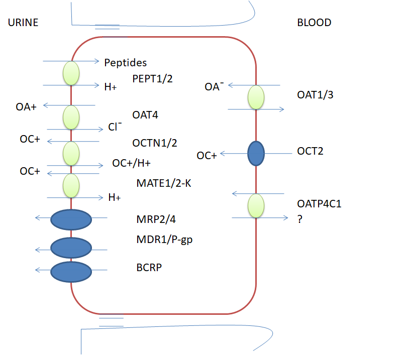 Fig. 2: Schematic model of the major drug TRS in human renal proximal tubular cells