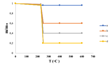Fig. 3: The illustration of TGA analysis of (a) MSP, (b) MSP functionalized with aminopropyl group (c) washed sample, (d) unwashed sample