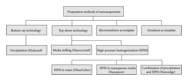 There are two strategies for the manufacturing of nanosuspensions, "Bottom-Up" and the "Top-Down" technologies. Traditional techniques for precipitation are classified "Base Up Technology". The "Top-Down Technologies" are the disintegration methods and are favoured over the precipitation methods. This incorporates High-Pressure Homogenization in water, Media Milling, High-Pressure Homogenization in nonaqueous media finally, blends of Precipitation and High-Pressure Homogenization.