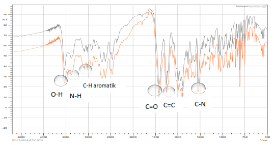 Data from the spectrum showed that the two substances tested were a similar compound. In the range 1600-1500 cm-1 there was a peak that indicated the presence of C-N bonds at a frequency of 1273.07 cm-1. In the range 1680-1620 cm-1 there was a peak indicating the functional group C = C with a frequency of 1624.13 cm-1. In the range 1725-1705 cm-1 there was a peak that indicated the presence of C = O bonds with a frequency of 1709 cm-1. In the range of 3150-2750 cm-1, there was a peak indicating an aromatic C-H functional group with a frequency of 3100.7 cm-1. In the range 3700-3000 cm-1 there was a peak which indicated that there was an N-H functional group with a frequency of 3378.47 cm-1. In the range 3700-3000 cm-1 there was a peak that indicated an O-H functional group with a frequency of 3529.88 cm-1 in the sample. The sample purity index value was 0.992739. These data quite similar to the FTIR result of Sahoo et. al results [25].