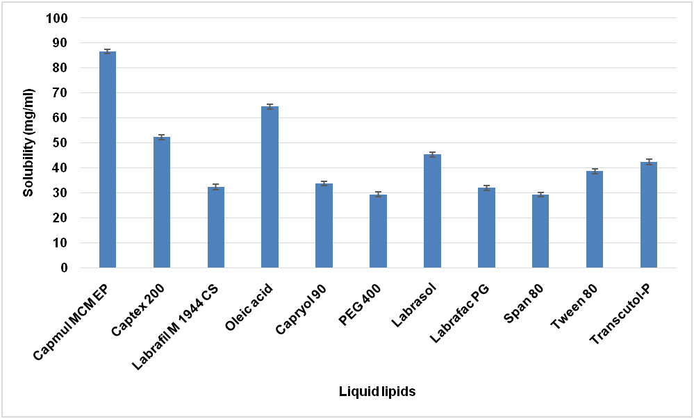 Fig. 1: The solubility of ZRS in liquid lipids; mean±SD, n=3