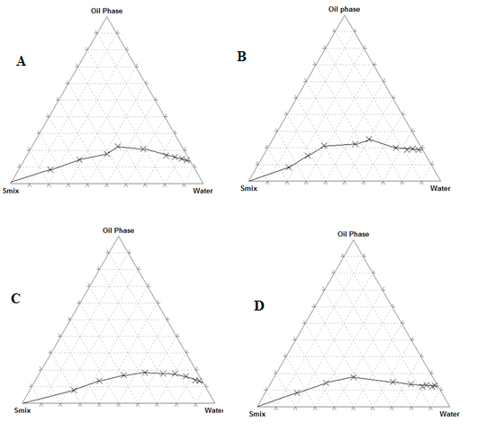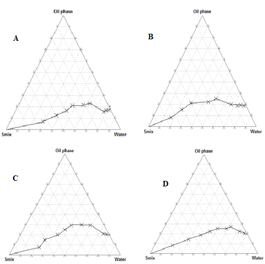 Phase diagrams which are essential in optimizing the Smix ratio were constructed using aqueous titration technique. Wherein, the selected oil phase was heated and maintained at a temperature of 75 °C, to which selected Smix was added in varying ratios (1:9, 2:8,3:7, 4:6, 5:5, 6:4, 7:3, 8:2 and 9:1) so as to form homogeneous mixtures. The mixtures so obtained were then titrated against the desired aqueous phase, and the changes observed were recorded visually [15].
