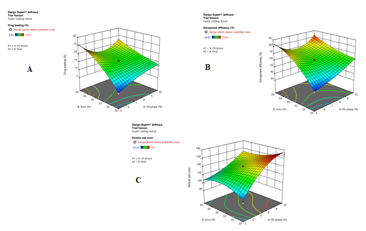 Fig. 6: Three-dimensional response surface plot depicting the impact of the oil phase and Smix on (A) drug loading (B) entrapment efficiency and (C) particle size of ZRS-NLCs