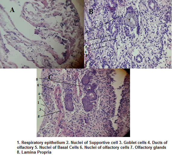 Fig. 10: Histopathological sections of sheep nasal mucosa treated with (a) IPA (b) ZRS-NLC and (c) PBS for nasal ciliotoxicity studies