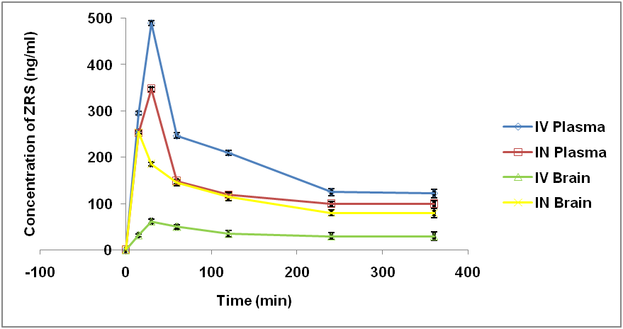 Results: Pharmacokinetic studies revealed a 10 fold increase (ZRS blood-brain ratio) for NLCs administered through nasal route (in comparison to intravenous route). Similarly, the concentration of ZRS (in the brain) delivered via nasal route exhibits 4 fold increment at all-time points.
