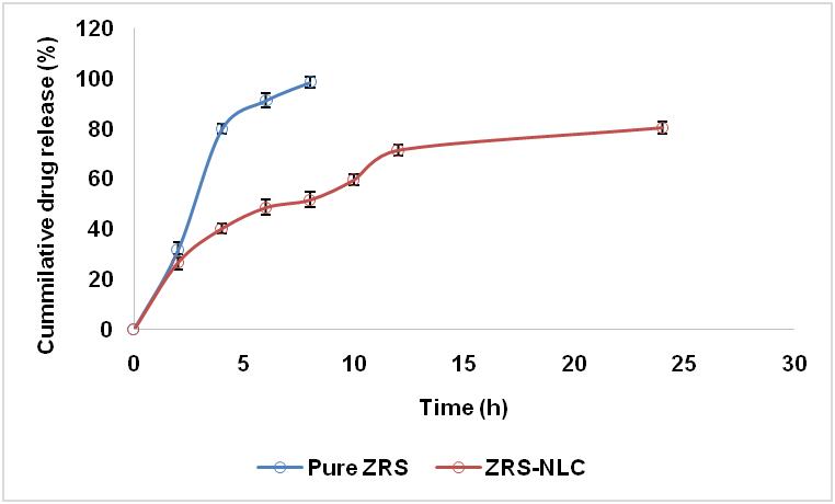 ZRS-NLC drug release profile was compared with pure ZRS (fig. 9) supported that, ZRS-NLC displayed sustained drug release. Accordingly, the drug release from pure ZRS was rapid (98.45 over 8 h) due to initial rapid ZRS release from the NLC surface, in contrast to prolonged-release from ZRS-NLC (26.72-80.34% over 24 h), thereby supporting the sustained delivery of the desired drug and hence, the effectiveness of the developed formulation. Additionally, the ZRS release pattern from the optimized formulation was bi-phasic, associated with an initial short-timed (2 h) burst release, followed by a long term (24 h) sustained-release [21].