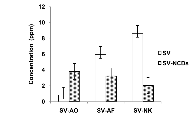 The results of X-ray diffraction showed the formation of a new peak on the diffractogram at 2ϴ at 28.96°. Changes in diffraction patterns and the formation of new peaks on diffractograms indicate the formation of NCDs [13].