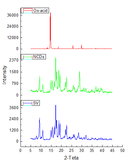 Fig. 2: X-ray diffractogram of SV, NCDs (SV-OXA), and oxalic acid (n=3)