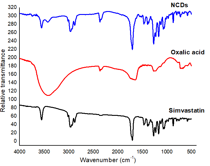 Based on the results of the infrared absorption spectrum, the interaction of hydrogen bonds between simvastatin and oxalic acid was evident as the absorption band C=O ester of the standard simvastatin at 1700.32 cm-1 shifted to 1704.18 cm-1 on the simvastatin co-crystals. This indicates that the expected hydrogen bonds have form3ed in the NCDs. Electronegative elements tend to attract electrons in between the carbon and oxygen atoms in the C=O bond, so that the bond becomes stronger; therefore the vibration band C=O bonds appear at higher frequencies [13]. From the shape of the spectrum image, it is evident that there is no change in the functional group of simvastatin.